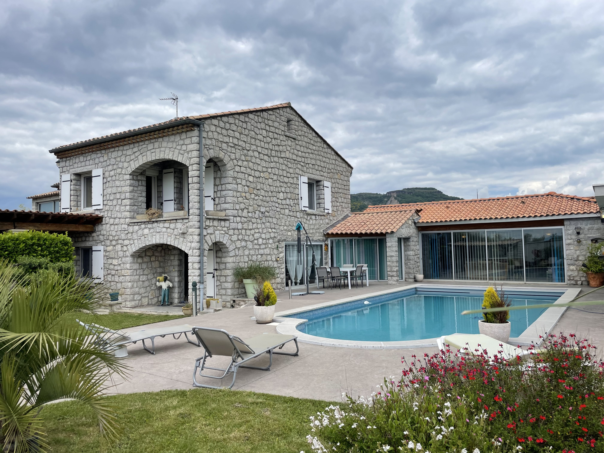 A vendre, Sud Ardèche, située entre Aubenas et Montélimar, Lussas, superbe propriété en pierre d'environ 246 m2 habitables avec dépendances. Un vrai coup de coeur !!! La maison se compose de deux logements communicants. Au rez de chaussée : un appartement de plain pied d'environ 100 m2 habitables comprenant une cuisine aménagée et équipée, une chambre, une salle d'eau, un wc, un bureau, un séjour de 51 m2, hammam, salle d'eau, deux dressings, coin buanderie . Au 1er étage : un second logement comprenant une véranda, une cuisine équipée et aménagée ouverte sur séjour d' environ 50 m2 avec poêle à granulés, deux chambres dont une d'environ 22 m2 avec dressing et petite terrasse privative, une salle d'eau, un wc, au deuxième étage : un dortoir mansardé d'environ 40 m2. Nombreuses dépendances : carport voitures, 2 garages ( environ 52 m2 et 33 m2), cave à vin. Piscine 12X5 avec volet roulant électrique, agréable terrasse couverte avec cuisine d'été aménagée et équipée avec four à pizza, coin barbecue. Terrain clos et arboré d'environ 1741 m2 . Aucun travaux à prévoir. Climatisation, aspiration centralisée, portail automatisé, arrosage automatique, coin pétanque. Honoraires à la charge du vendeur. Erp consultable en agence. Estimation des coûts annuels d'énergie du logement entre 2550€ et 3530€. A découvrir absolument ! Agence Dupont Immobilier, partenaire de votre projet immobilier. Retrouvez-nous sur www.ardeche-immobilier.com