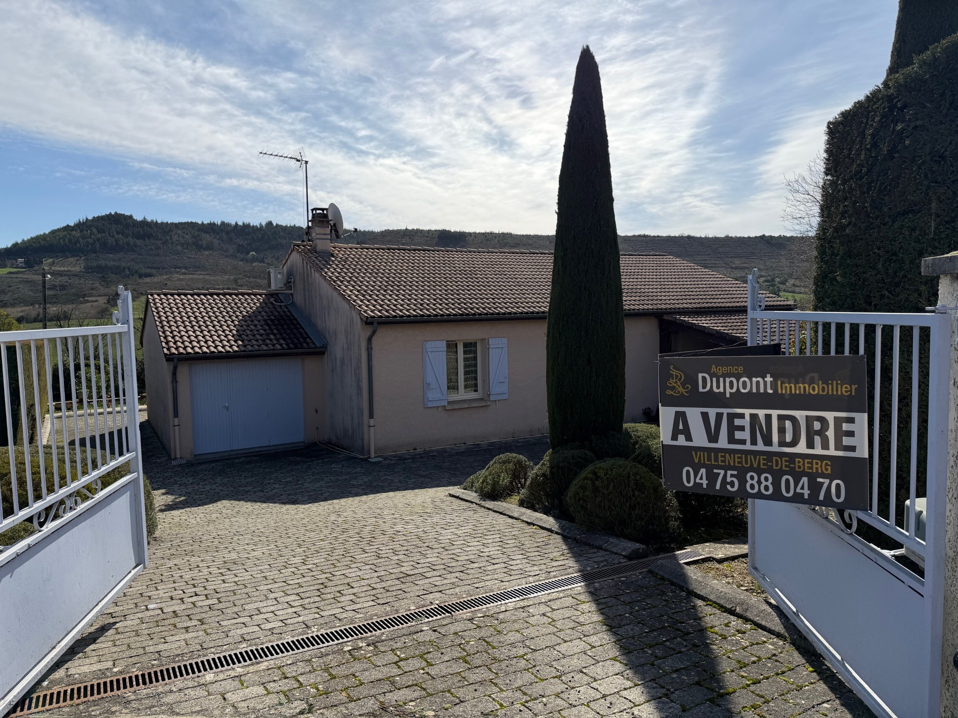 A vendre, Sud Ardèche, Villeneuve de Berg, maison de plain-pied comprenant : un hall d'entrée, une cuisine indépendante, un séjour, trois chambres, une salle de bains, un wc, un dégagement avec placard. Une terrasse, un abri voiture. Un garage. Terrain d'environ 1073 m2. Honoraires à la charge du vendeur. Erp consultable en agence. Estimation des coûts annuels de l'énergie entre 1370€ et 1930€. Agence Dupont Immobilier, partenaire de votre projet immobilier. Retrouvez-nous sur www.ardeche-immobilier.com